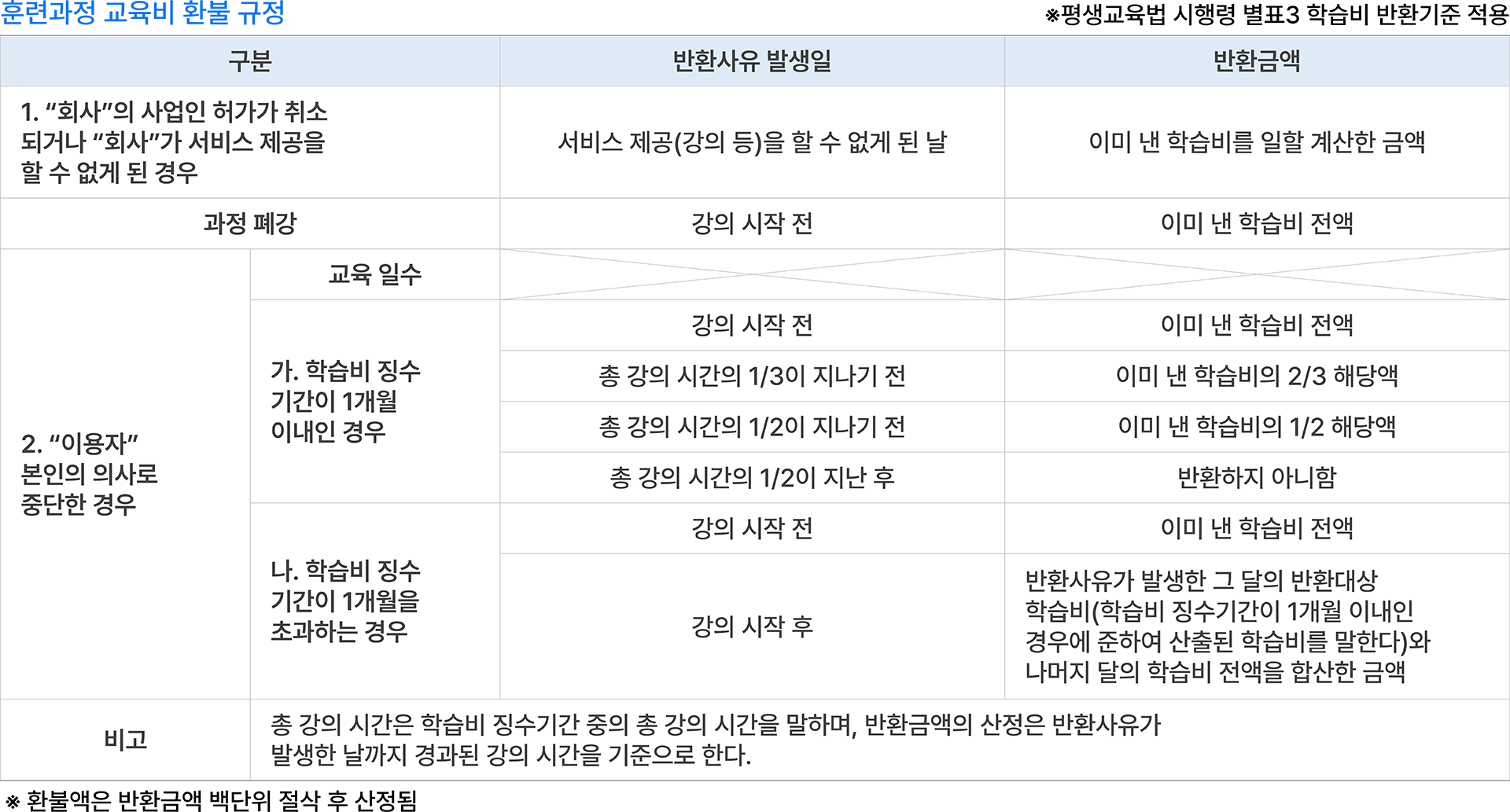훈련 중도 취소 및 환불은 ‘훈련과정 교육비 환불 규정’에 따라 진행됩니다.