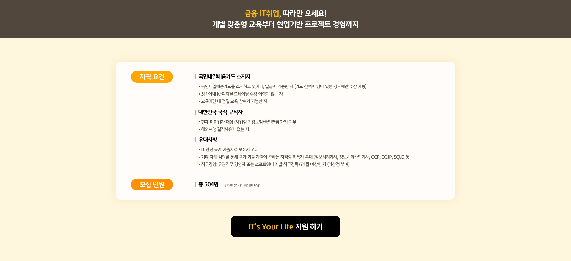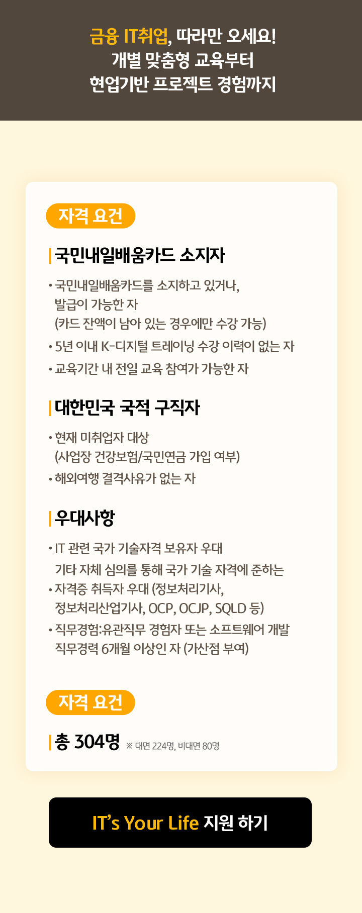 - 국민 내일배움카드를 소지하고 있거나, 발급이 가능한 자 (카드 잔액이 남아 있는 경우에만 수강 가능)