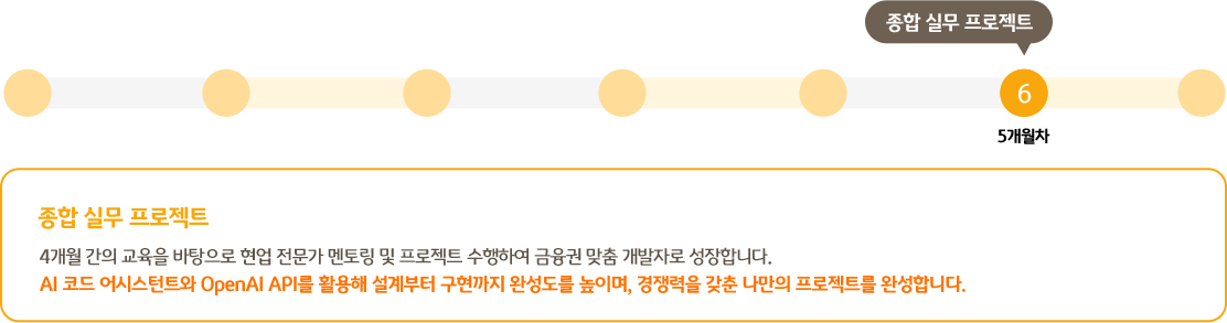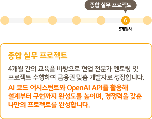 5개월차 : 종합 실무 프로젝트 - 4개월 간의 교육을 바탕으로 현업 전문가 멘토링 및 프로젝트 수행하여 금융권 맞춤 개발자로 성장합니다.
